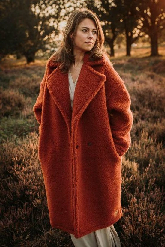 Jas Moods van het merk Alwero in de kleur brick. Wauw wat een verschijning deze jas! Heerlijke teddy jas gemaakt van 100% wol. Het is een oversized model en in drie maten verkrijgbaar. De jas is niet gevoerd omdat de functie van de wol dan verdwijnt.