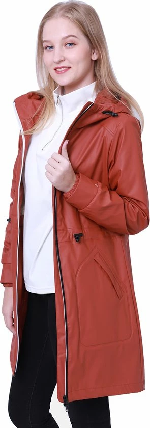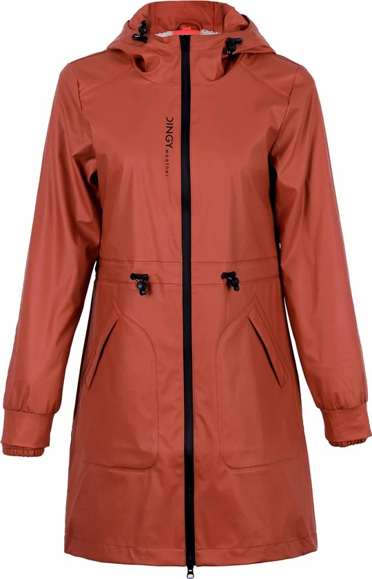 De Jasmine regenjas voor dames van Dingy Weather is ontworpen uit gerecycleerde PU-stof en 100% polyester. Daardoor heeft de jas een waterdichtheid van maar liefst 5000 mm en zorgt hij voor maximale bescherming in wind en regen. De binnenvoering bestaat uit twee materialen. De bovenkant is samengesteld uit zachte teddystof en de onderzijde uit 100% polyester.