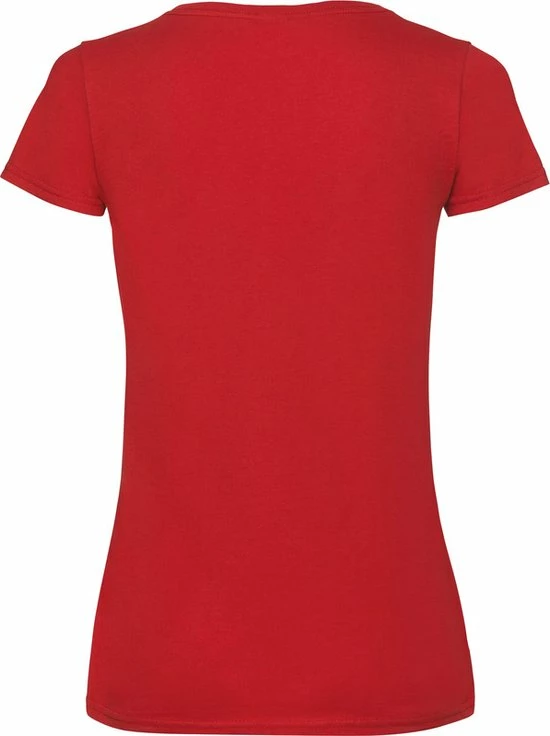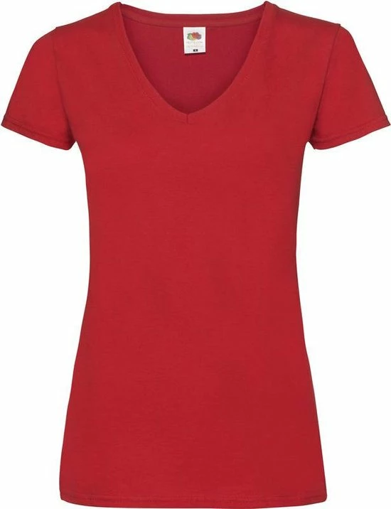 Basic V-hals katoenen t-shirt in de kleur rood voor dames. Een rood dames t-shirt van Fruit Of The Loom met korte mouwen en een v-hals. Materiaal: 100% katoen. Kwaliteit: 165 gram/m2. Casual dameskleding basic shirts met V-hals.