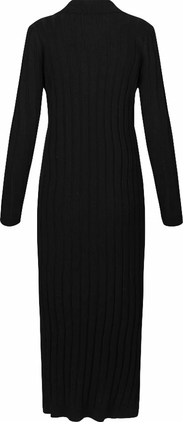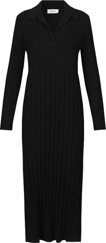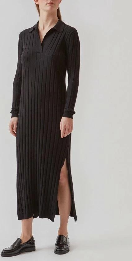 Zwarte rib gebreide midi-jurk van het merk Modstrom. De aansluitende midi-jurk van ribbreisel heeft lange mouwen en splitten aan beide zijkanten. De zwarte Avery jurk heeft een V-hals en kraag in smalle rib.