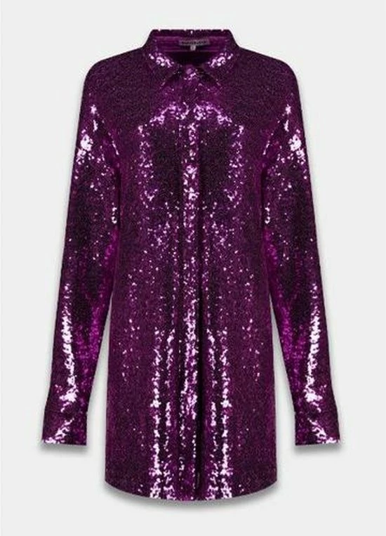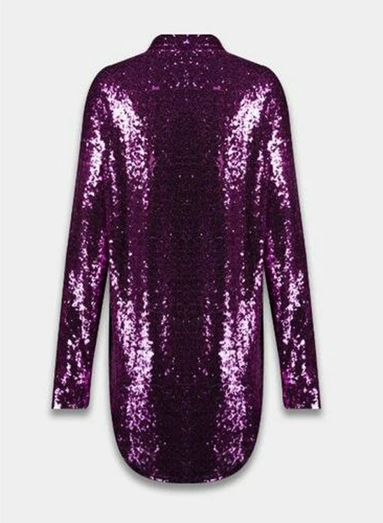 Party on in deze fantastische paarse pailletten jurk met satijnen omslag aan de mouw. Ook kan dit model open gedragen worden als blazer.