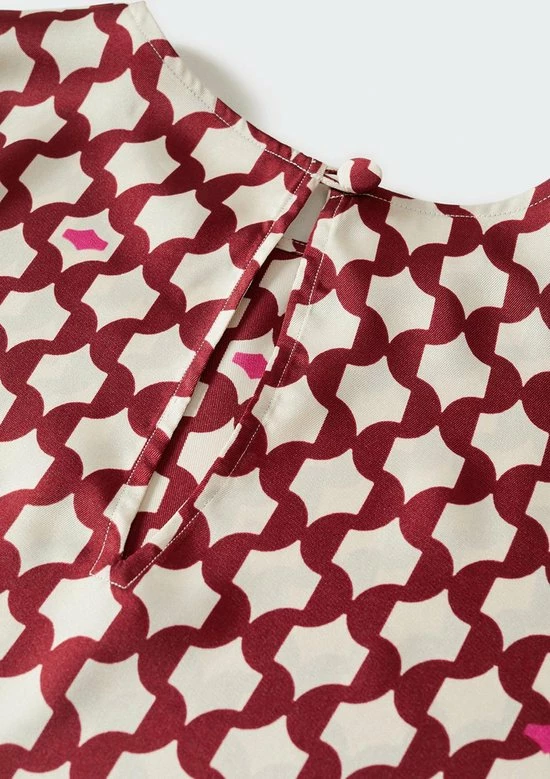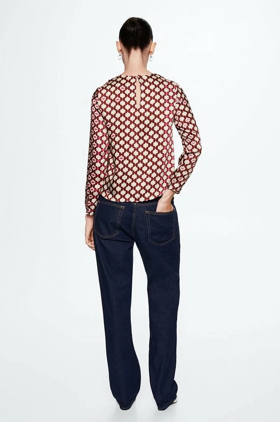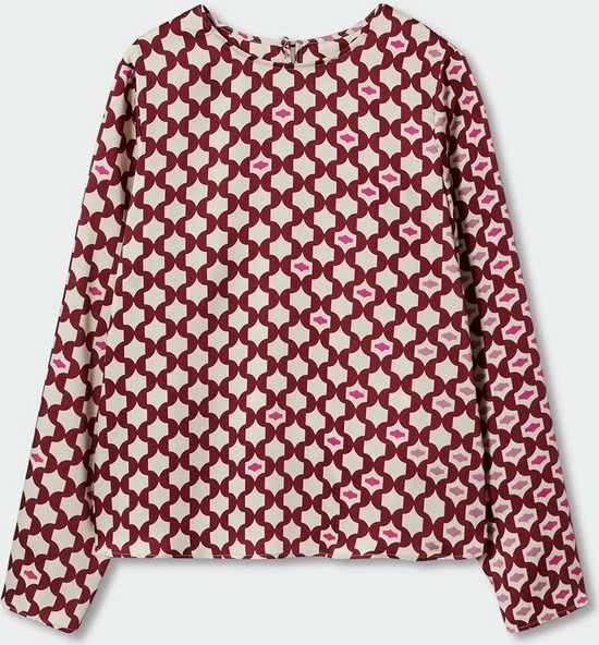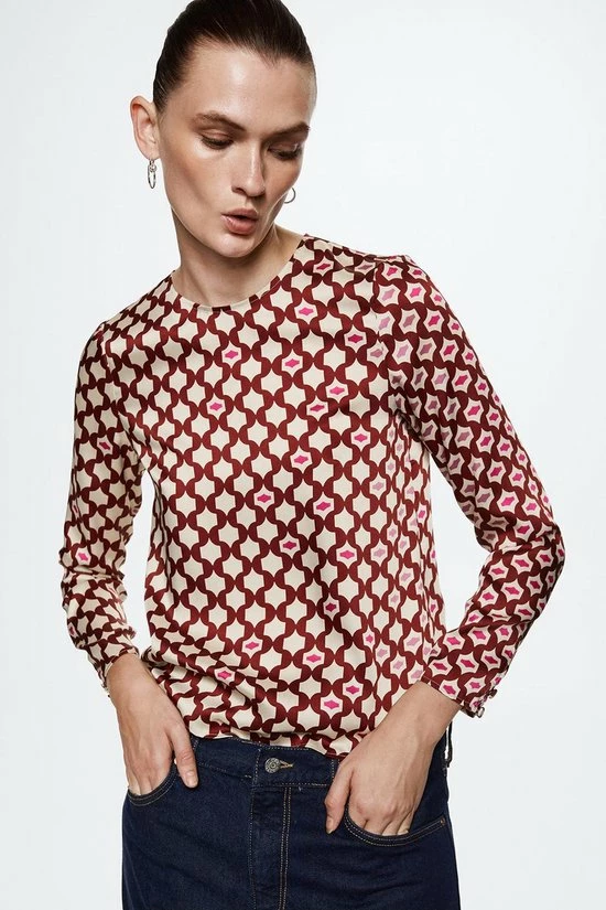 Blouse van Mango met een grafisch patroon. De lange mouwen hebben een aantal knoopjes aan de onderkant. De blouse heeft een ronde hals met een knoopje in de nek.