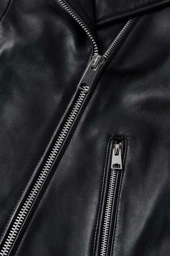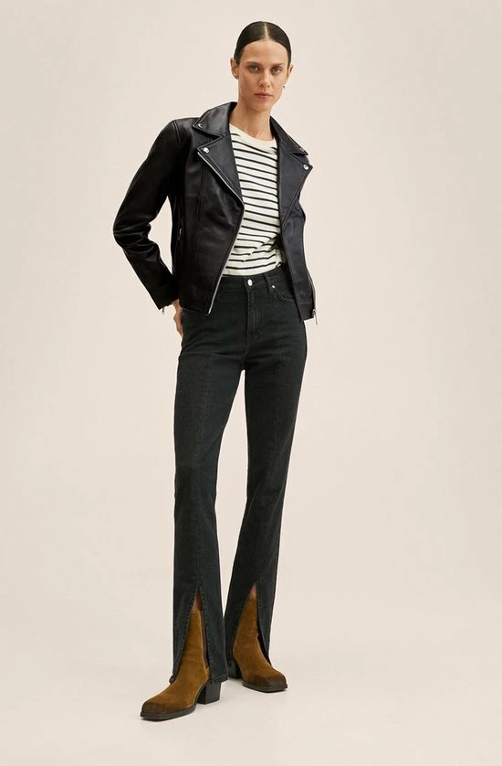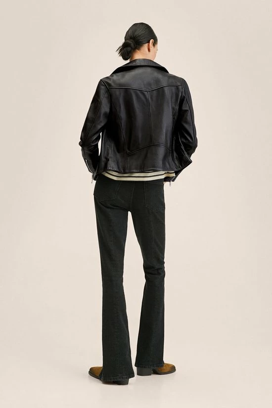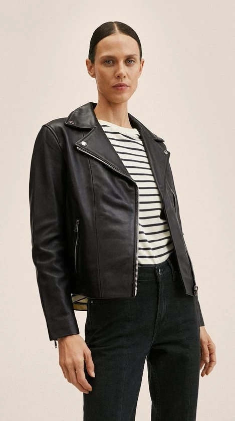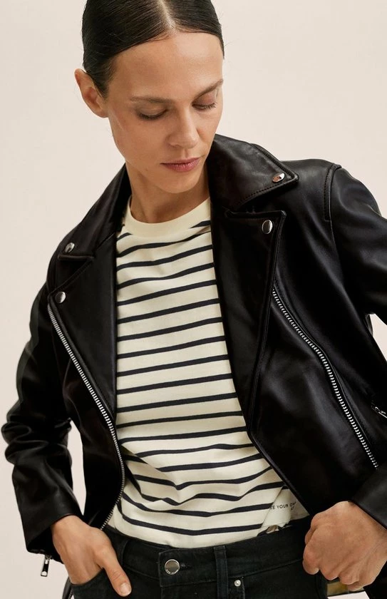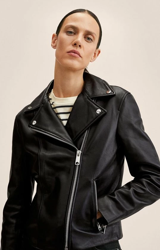 Bikerjack van Mango. Dit model heeft lange mouwen en een revers kraag met decoratieve knopen. Het jack heeft twee zakken met een rits en sluit tevens ook met een rits aan de voorkant. Deze bikerjack is gemaakt van duurzaam schapen leer en heeft daarom het Committed label van Mango gekregen.