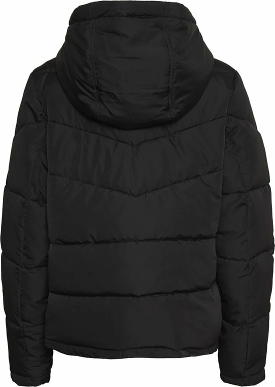 Zwarte puffer jacket met capuchon. De jas heeft een ritssluiting en 2 patch pockets.