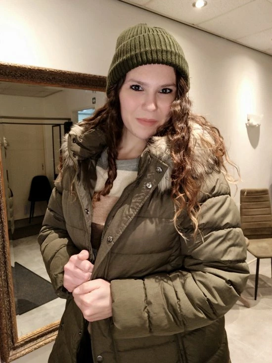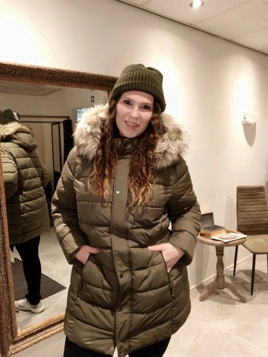 Groene winterjas van het merk Only Carmakoma. Jas heeft een (nep) bontkraag. Sluiting door middel van rits en drukknoppen. Zakken voorzien van rits.