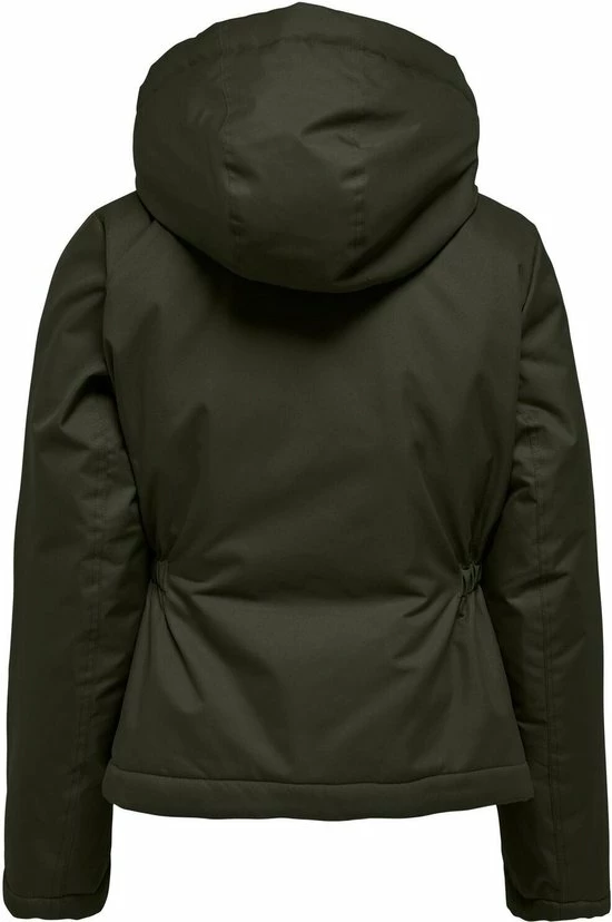 Getailleerde winterjas van Only. Dit model heeft lange mouwen en een vaste capuchon. De jas is voorzien van twee klepzakken en een borstzakje. Door middel van een rits en een extra windflap met knopen sluit de jas.