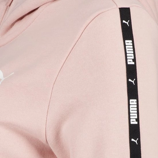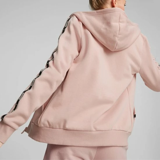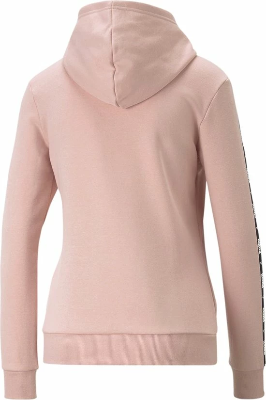 Lichtroze Puma Power Tape vest voor dames. Voorzien van een ritssluiting en capuchon. Het sweatvest heeft twee zakken aan de voorzijde en zwarte details met merkopdrukken op de armen. Gemaakt van 100% katoen.