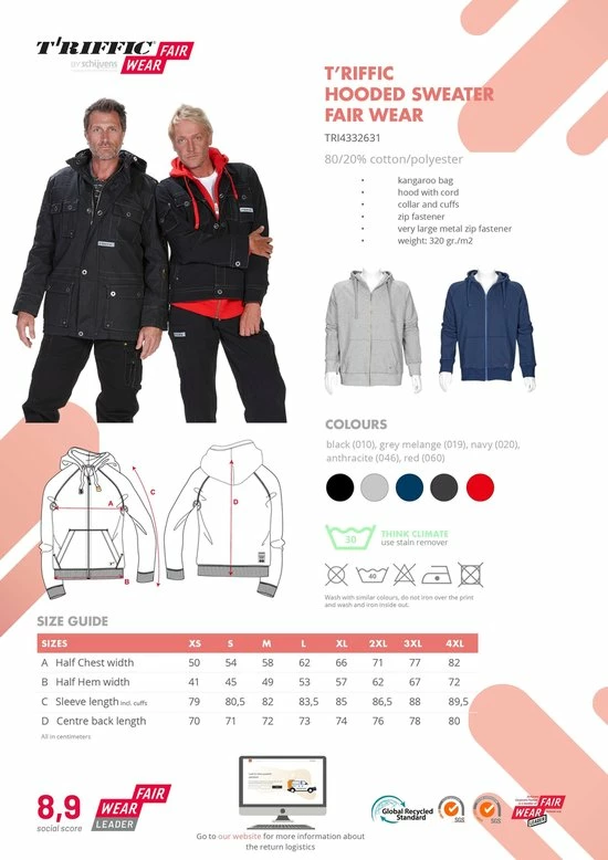 De T’riffic hooded sweater met ritssluiting heeft een tijdloze uitstraling en is gemaakt van 80% katoen en 20% polyester. Het vest heeft een sportieve look door de insteekzakken en het koord in de capuchon. T’riffic is ‘leader’ op het gebied van sociaal duurzaam produceren. De categorie ‘leader’ wordt bepaald door Fair Wear Foundation.