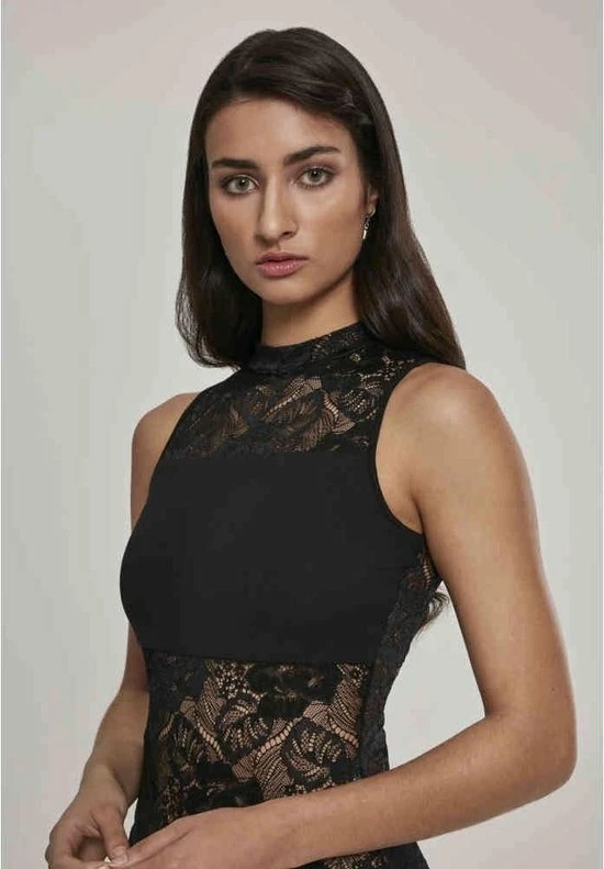 Urban Classics. This summer is about to get hot! Put on this high-necked body made of delicate lace and allow your feminine side to express itself. A jersey insert discreetly covers the chest area. Open and close the body at the crotch through handy hooks and eyelets. Also nice to have, the filigree zipper on the neck. The close-fitting form is emphasized by the wide cut shoulders at the back. Don’t be shy, show what you got – in style!