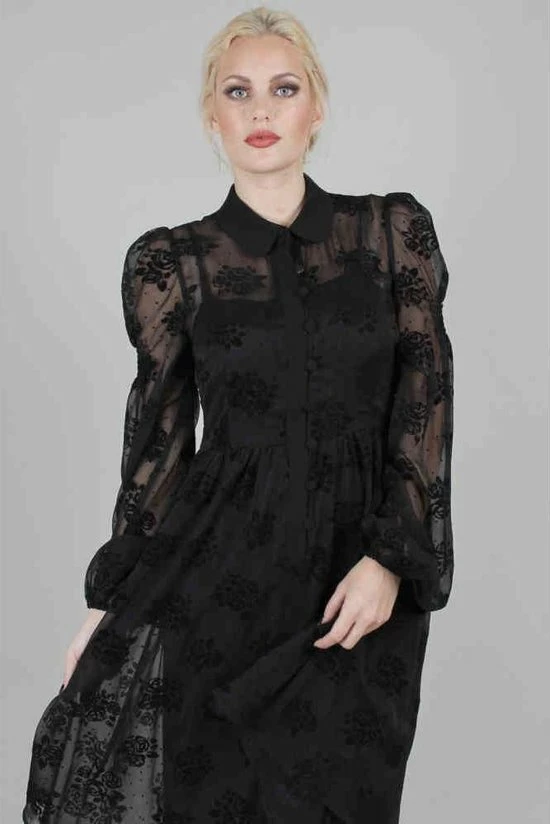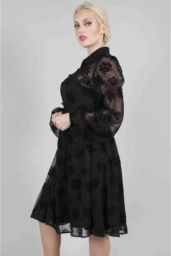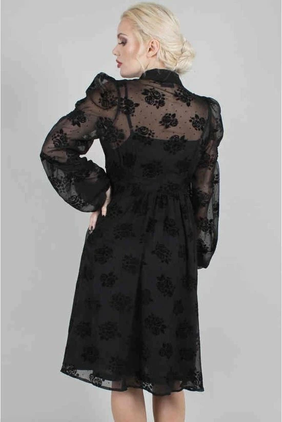 Blanca Chiffon Rose Flocking jurk. Zwarte fluwelen bloemen op een chiffon jurk met knopenrij en lange mouwen. Deze flared jurk komt met voering.