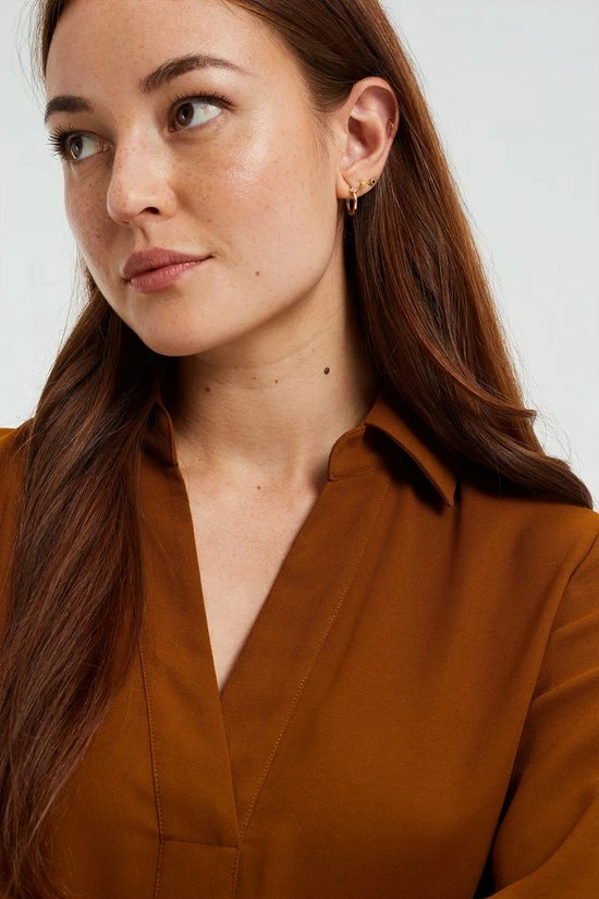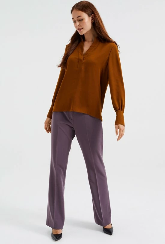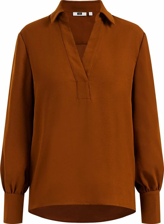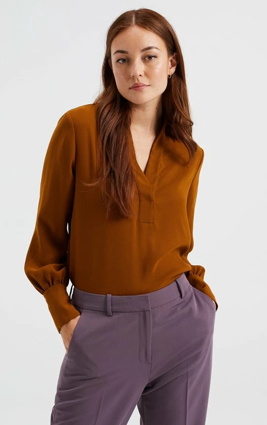 Een regular fit blouse van een geweven kwaliteit met een V-hals, een kraag en lange mouwen.