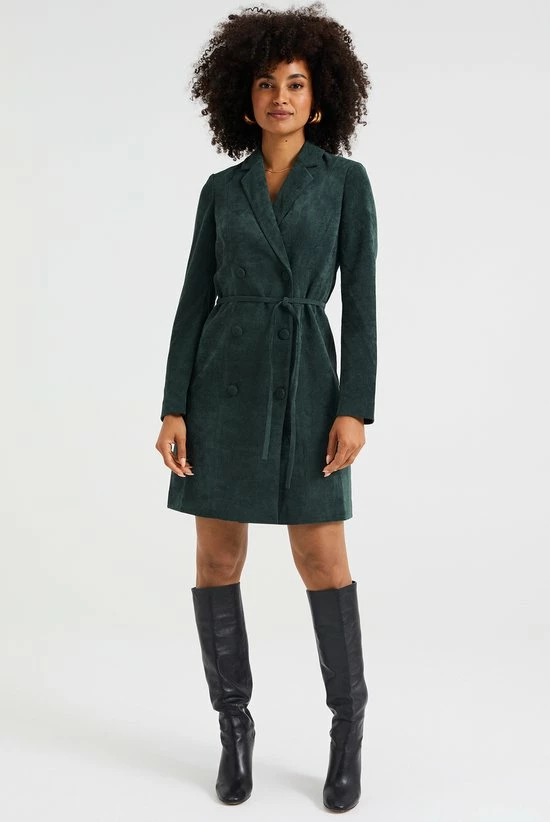 Een regular fit double-breasted blazerjurk van corduroy met toegevoegde stretch en een strikceintuur. Het korte model heeft een V-hals en lange mouwen. Gevoerd.