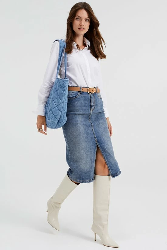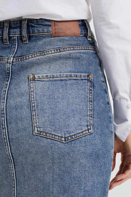 Een regular fit, midi rok van denimkatoen met toegevoegde stretch en een split op het voorpand. Het model heeft een knoop- en ritssluiting op het voorpand.