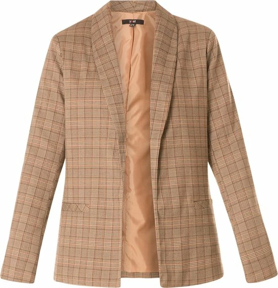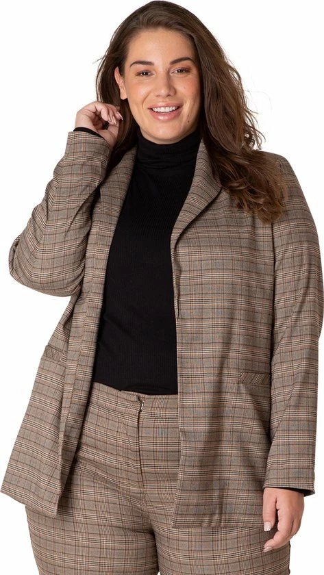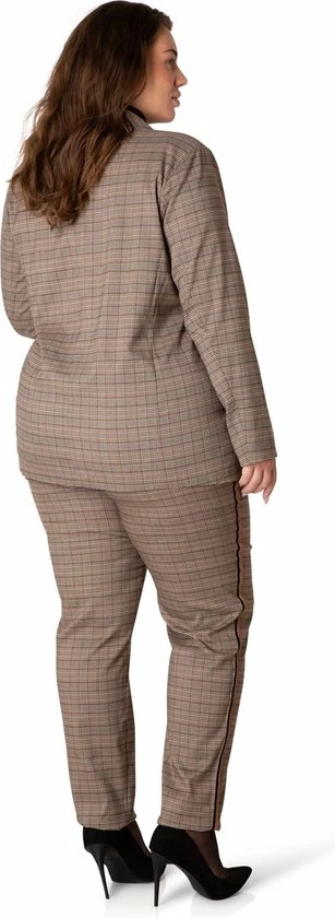 Ruitjes zijn helemaal hot en trending. Yesta heeft hier een losvallend model gemaakt in een getailleerd en iets korter model. De blazer heeft een smalle rever en in het voorpand zitten paspel zakken. De broek in dezelfde ruit is artikel A32775.