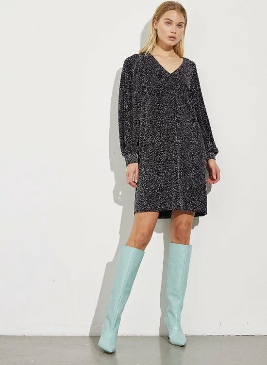 Zwarte mini jurk met zilveren glitters van het merk mbyM. De korte glitterjurk heeft een hals en lange mouwen met gesmokte mouwzoom. De jurk valt losjes. Deze glitterjurk is perfect geschikt voor een feestje.
